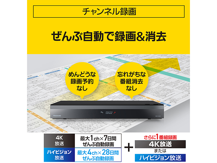 ハイビジョン放送[最大4ch×約28日間]+4K放送[最大1ch×約7日間]※1の番組を自動で録画。
