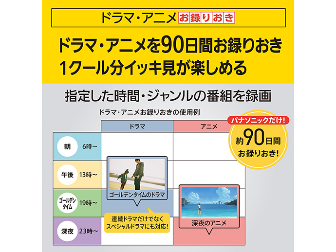 - 19時~22時台に放送開始する地上デジタル放送のドラマを設定した場合(お録りおき日数は、1日あたり3時間分の番組を録画した時の日数)。初期状態で設定済です。お録りおき録画する番組は、全自動録画された番組が対象です。