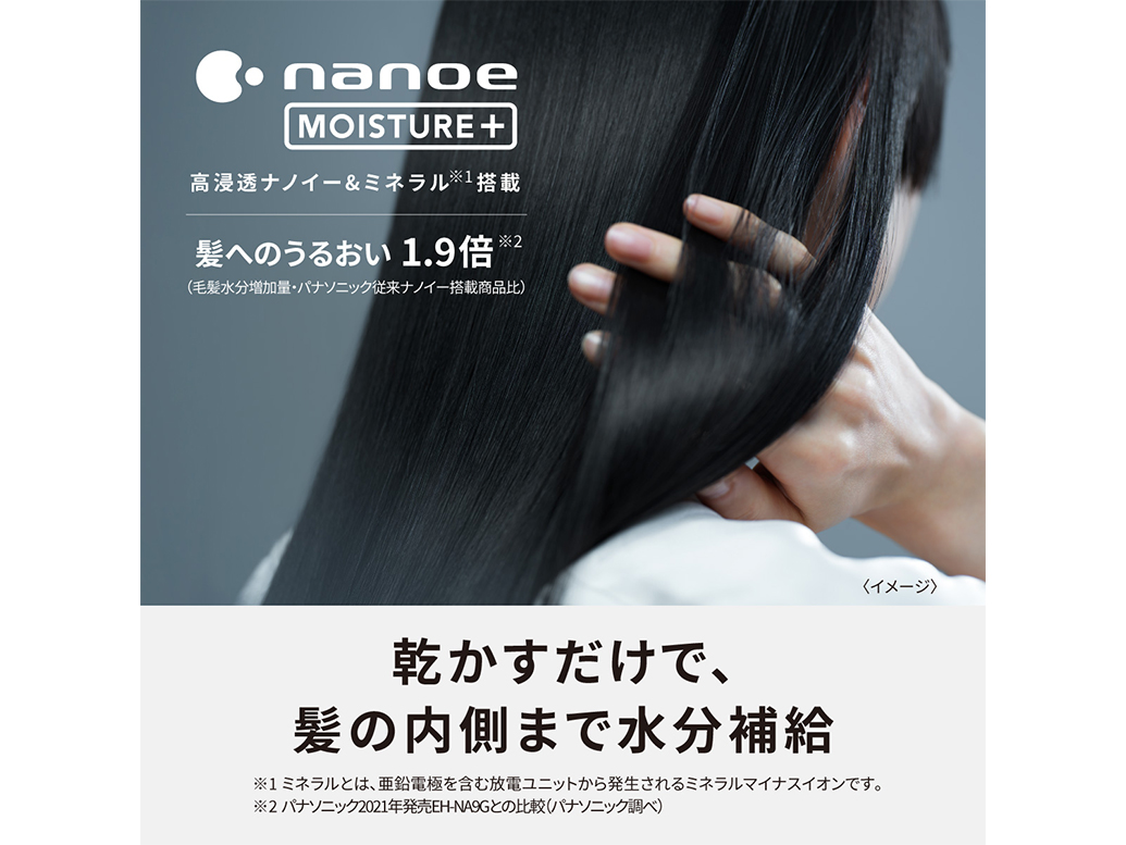 高浸透ナノイーは従来のナノイーと比べ、髪の内部まで浸透。内側まで水分がとどき髪に驚きのうるおいとなめらかさをもたらします。さらに高浸透ナノイー&ミネラル※1吹き出し口が髪により近くなり風が髪に届きやすくなりました。