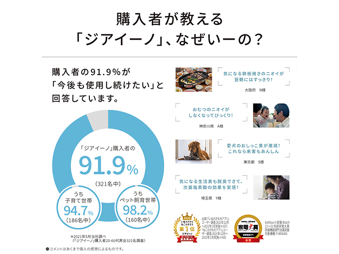 パナソニックの次亜塩素酸 空間除菌脱臭機「ジアイーノ」(F-MV4300)は、料理や生ごみの臭いなど、気になる生活臭を次亜塩素酸で分解消臭します。また、風路切替機構により、除菌脱臭しながら季節に応じて加湿量を選べる機能を新搭載。乾燥が気になる季節には、加湿「多め」運転でしっかりとうるおいを届けます。
