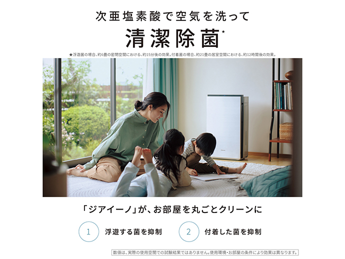 - 浮遊菌の場合。約6畳の密閉空間における、約20分後の効果※2 付着菌の場合。約18畳の居室空間における、約12時間後の効果※3