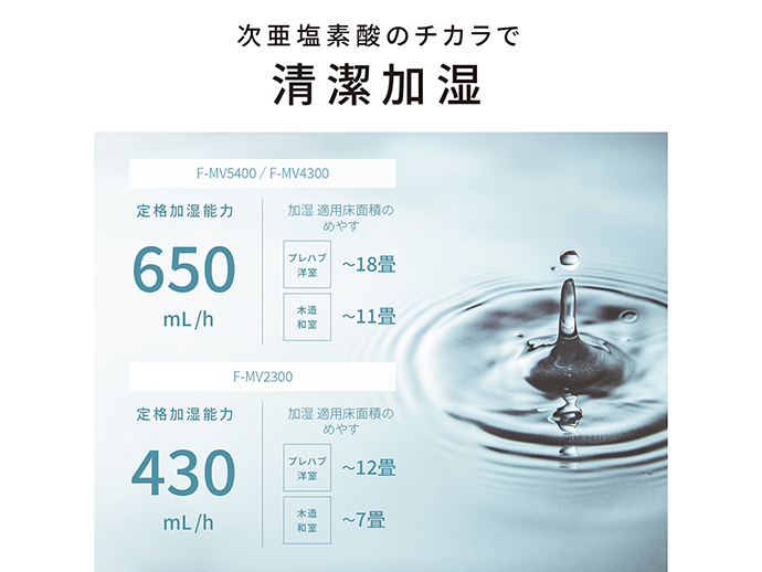- 加湿量、適用床面積は「日本電機工業会規格(JEM1426)」に基づく、室温20℃・湿度30%の場合です。室内の温度や湿度によって、加湿量、連続運転時間は変わります。