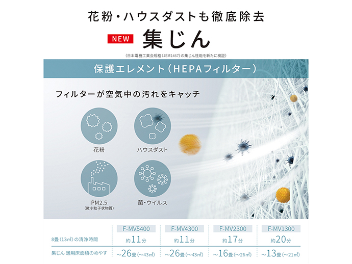 - 【試験機関】株式会社環境管理センター【試験方法】6段階臭気強度表示法による検証【脱臭の方法】次亜塩素酸 空間除菌脱臭機(F-MV4300)を風量「強」・加湿「標準」・電解強度「強」運転で実施【対象】約6畳の試験空間の発生し続ける空間臭【臭気成分】擬似ペット臭、擬似介護臭、擬似生ごみ臭、擬似排水口臭、焼き魚臭、擬似汗・体臭【試験結果】〈擬似ペット臭〉約75分後に臭気強度1.8に低減(自然減衰3.8)、〈擬似介護臭〉約60分後に臭気強度1.4に低減(自然減衰3.6)、〈擬似生ごみ臭〉約30分後に臭気強度1.8に低減(自然減衰3.3)、〈擬似排水口臭〉約60分後に臭気強度2.0に低減(自然減衰3.9)、〈焼き魚臭〉約90分後に臭気強度1.6に低減(自然減衰3.6)、〈擬似汗・体臭〉約60分後に臭気強度2.0に低減(自然減衰3.9)【試験番号】H21687702DB(擬似ペット臭)、H21687701DB(擬似介護臭)、H21687704DB(擬似生ごみ臭)、H21687705DB(擬似排水口臭)、H21687803DB(焼き魚臭)、H21687706DB(擬似汗・体臭)