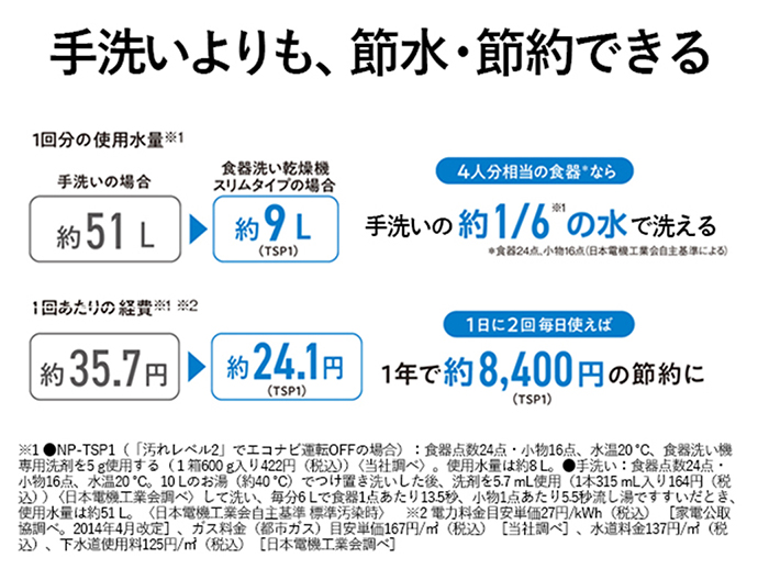 4人分相当の食器なら手洗いの約1/6の水で洗える!