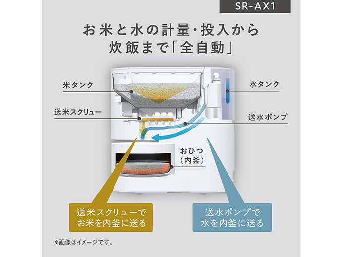 米タンクに無洗米を補充し、水タンクをセットするだけ。計量から炊飯まで全自動。