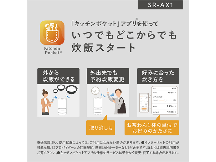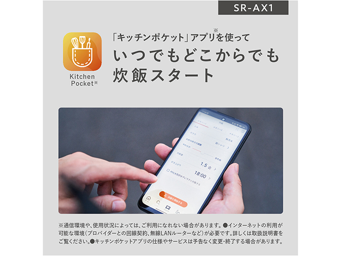 ※通信環境や、使用状況によっては、 ご利用になれない場合があります。●キッチンポケットアプリのインストールはAndroid™スマートフォンはGoogle Playで、 iPhoneはApp Storeで可能です。●キッチンポケットアプリは無料です。インストールおよびサービスのご利用には、 通信費がかかります。●常時インターネット接続が可能な環境が必要です。●無線LANブロードバンドルータ(IEEE802.11b/g/n、 周波数帯(2.4GHz帯)、 暗号化方式WPA™(AES)/WPA2™(AES)/WPA3™(AES))が必要です。●全ての無線LANルーターについての動作保証はしていません。モバイルルーターの動作保証はしていません●Android™およびGoogle Playは、 Google LLCの商標または登録商標です。●iPhoneは、 米国および他の国々で登録されたApple Inc.の商標です。iPhoneの商標は、アイホン株式会社のライセンスに基づき使用されています。●App StoreはApple Inc.のサービスマークです。●Android™ OSバージョン 8.0以上、iOSバージョン 13.0以上のスマートフォンでご利用になれます(2023年5月現在)。ただし、全てのスマートフォンでのアプリの動作保証はしていません。●キッチンポケットアプリの仕様やサービスは予告なく変更・終了する場合があります。