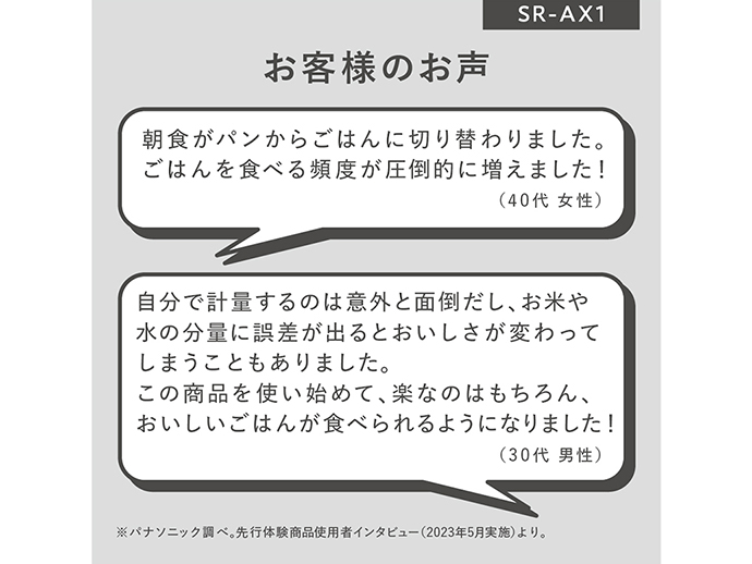 ご飯がツヤツヤしてもっちもっちでとても美味しいです!また私1人の少量も完璧に炊き上がります!食事の時間が家族違う場合が多いのでとても便利です!パンよりもお米を食べる機会が増え、毎回食べ切れます。本当に買って良かったです。